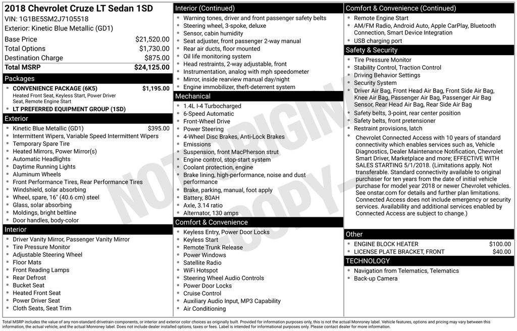 2018 Chevrolet Cruze LT LT Kinetic Blue Metallic 1.4L 4-Cylinder Turbo DOHC CVVT 6-Speed Automatic FWD