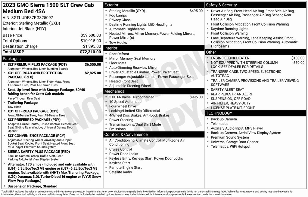 *Adaptive Cruise Control, Heated and Cooled Seats, Navigation System, Touchscreen Controls, Backup Camera, Keyless Access with Push Button Start, Automatic Headlights, Apple CarPlay, Android Auto, Voice Recognition, REMOTE START, AWD / 4x4 / Four Wheel Drive, 10-Speed Automatic, 4WD, Jet Black Leather, 20" Polished Aluminum Wheels, Adaptive Cruise Control, All-Weather Floor Liner (LPO), Chrome Wheel To Wheel Assist Steps, Floor-Mounted Center Console, Front Bucket Seats, HD Surround Vision, Heated 2nd Row Outboard Seats, Hitch Guidance, Hitch Guidance w/Hitch View, In-Vehicle Trailering App, Integrated Trailer Brake Controller, Power Rake & Telescoping Steering Column, Power Sliding Rear Window w/Rear Defogger, Premium Bose 7-Speaker Sound System, ProGrade Trailering System, Rear Cross Traffic Braking, Rear Pedestrian Detection, Safety Alert Seat, Sierra Safety Plus Package, SLT Convenience Package, SLT Preferred Package, SLT Premium Plus Package, Spray-On Pickup Bed Liner w/GMC Logo, Trailer Camera Provisions, Trailer Side Blind Zone Alert, Trailering Package, Ultrasonic Front & Rear Park Assist, Universal Home Remote, Ventilated Driver & Front Passenger Seats, Wheels: 20" Polished Aluminum w/RFX, Wireless Charging, X31 Off-Road & Protection Package, X31 Off-Road Package.